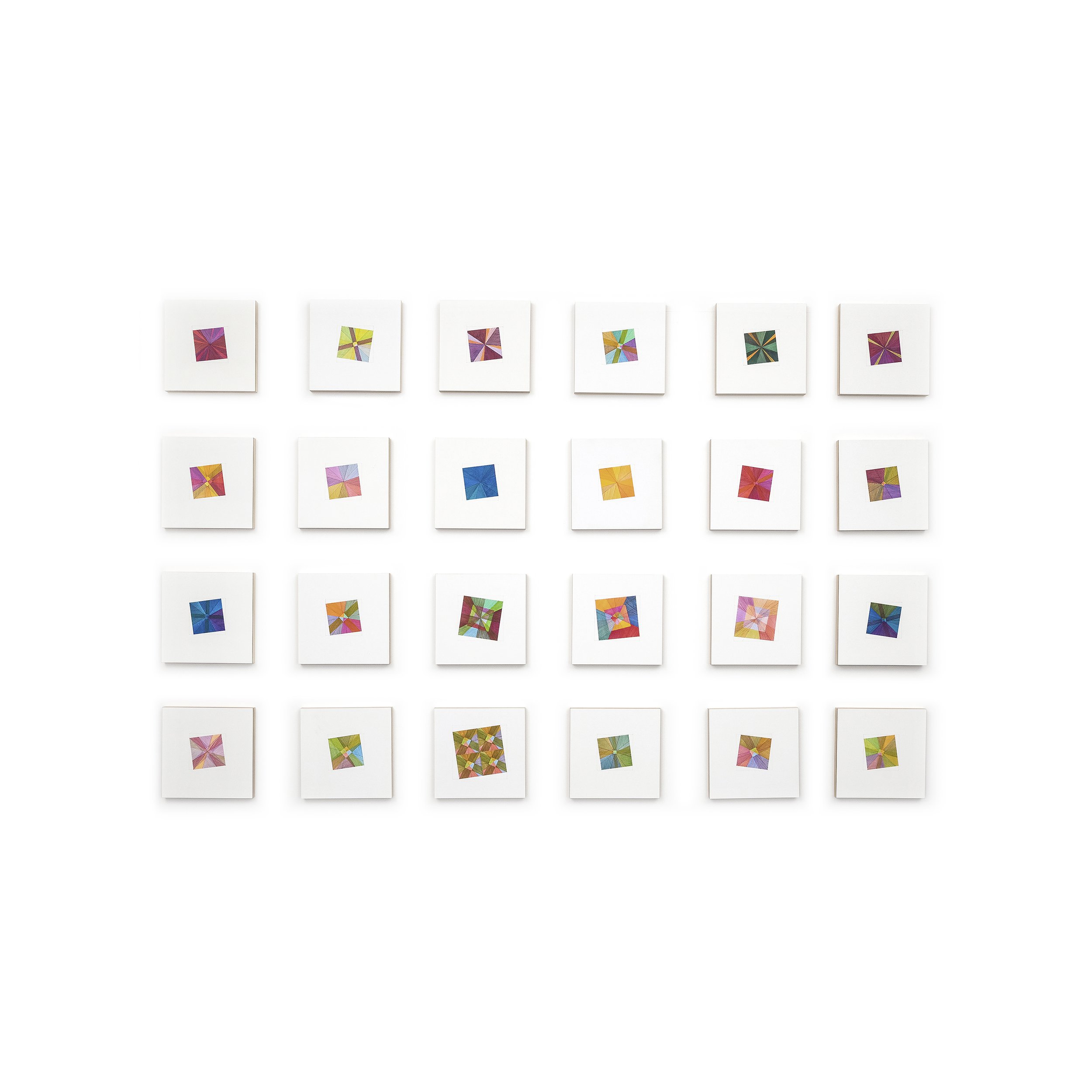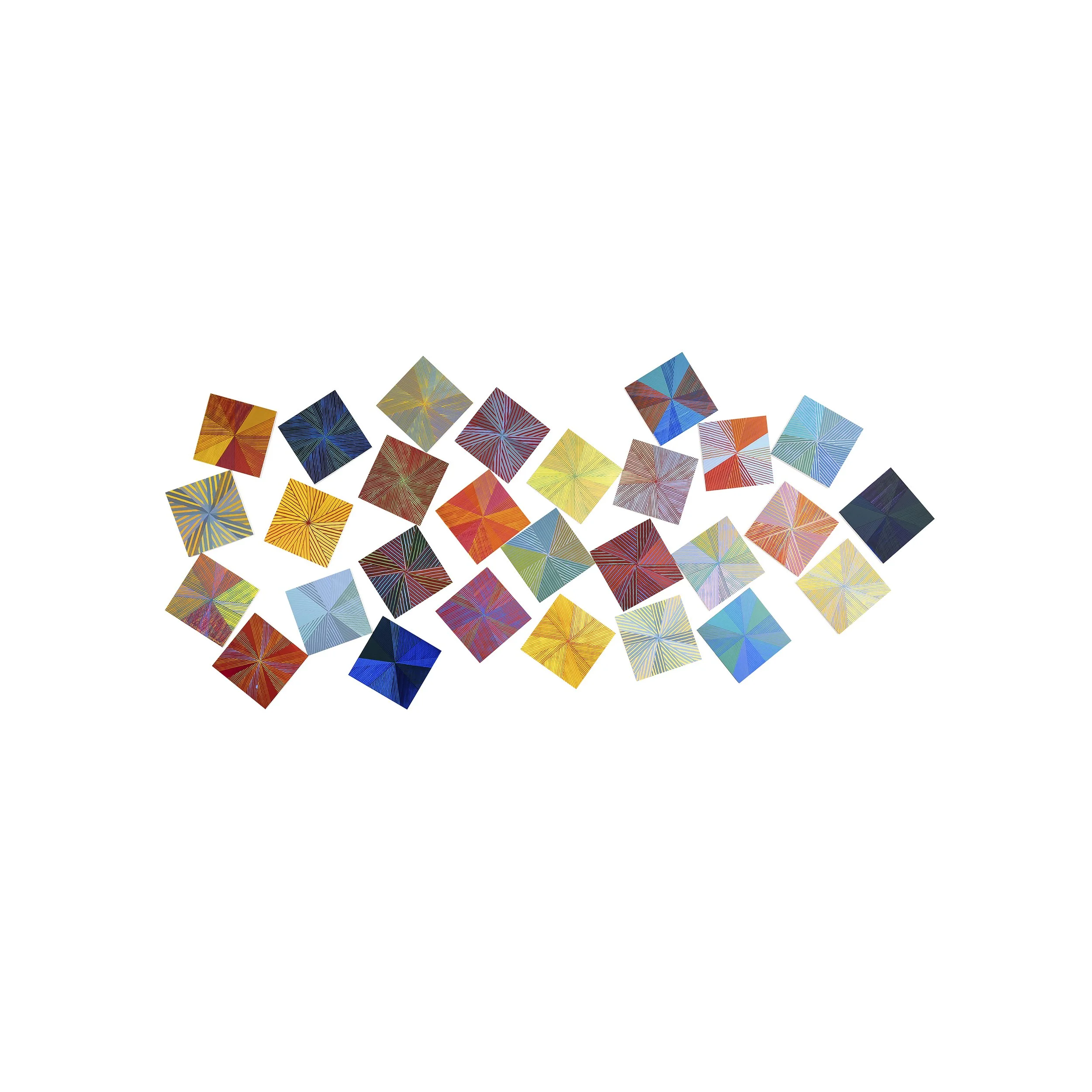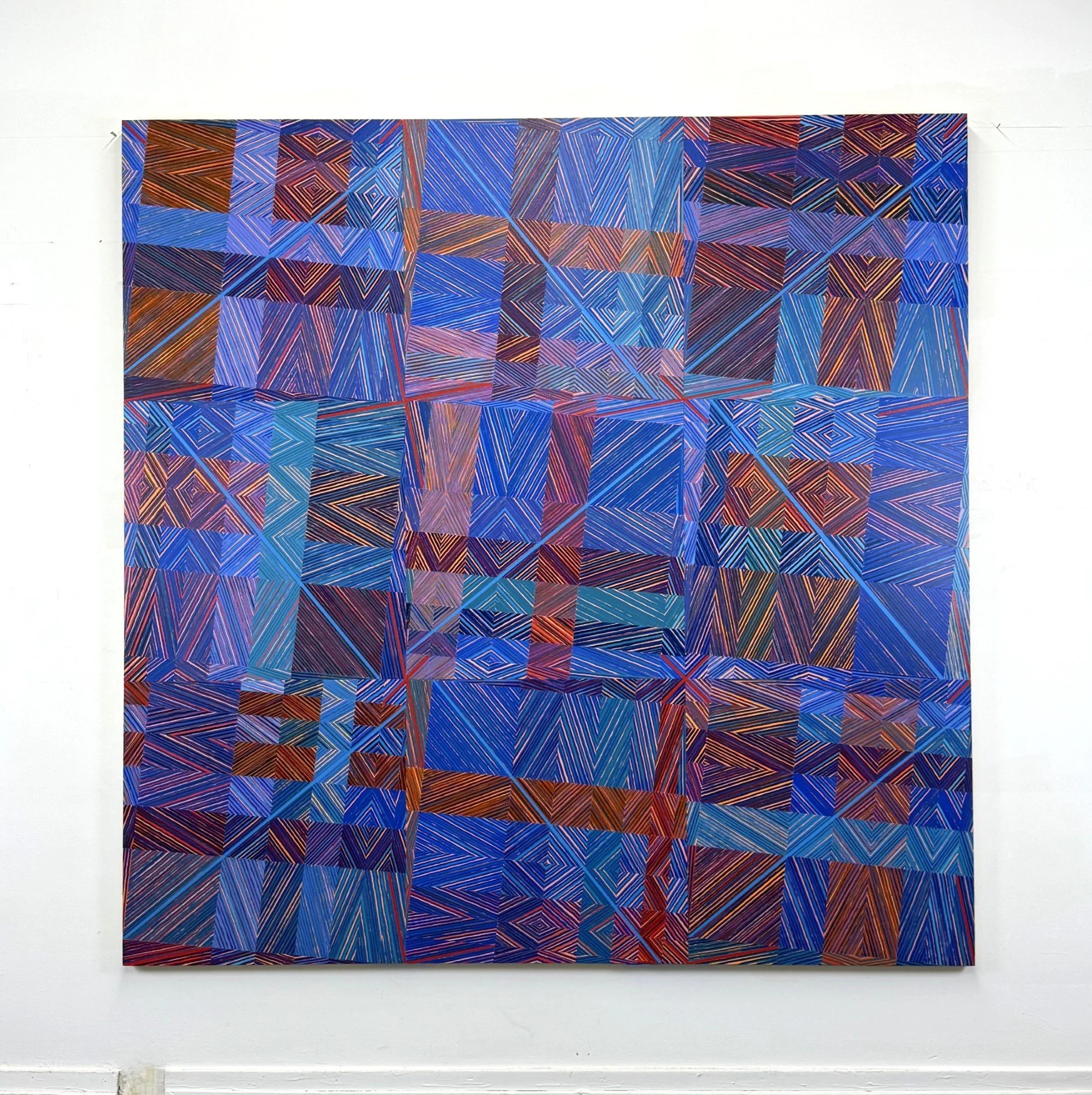 “Democracy in the crosshairs” became part of my pictorial conversation with “Crosshairs,” 2024 and continued through the “Mirino” paintings, while remaining part of the Breath series. The Spin drawings and installation were a reaction to the 47th president’s lies and flurry of executive orders upon inauguration. “Rotator,” 2025 breaks with the inhale/exhale grid configuration I’ve used since 2022 and in “Fault Lines,” no horizontal or vertical lines exist, producing a more chaotic, spinning energy.